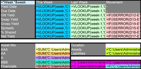 The individual formula maps (sample extract above) highlight the fundamental structure of each worksheet by stripping away all formatting and replacing it with a simple colour-coded framework of the underlying formula and data that drive the spreadsheet. By applying the same colour to like-for-like formula, and displaying the formula directly, the user can quickly identify areas of interest, complexity and likely errors.